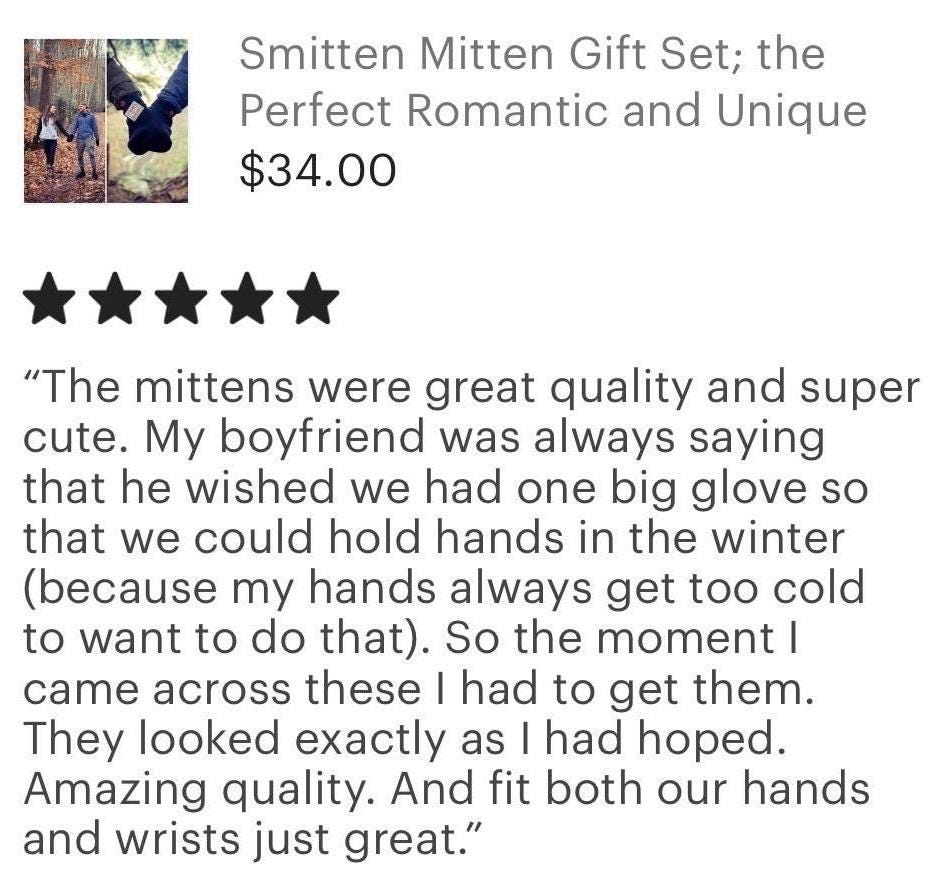 Hannah and her shop are both absolutely FANTASTIC!! I asked for a bit of a customization on my order—a bee on one side and a heart on the other—and Hannah not only took care of that without any problem, but she also informed me that there was a card included where I could write a message to my wife. The card was so wonderful and adorable and had an additional personal touch from Hannah in how she was able to print an emoji icon in there (which I didn’t even realize you could do!) for the pet name I use for my wife. I gave the gift to my wife last night and what else can be said other than she was smitten by the Smitten Mittens!! Thank you, Hannah!! 🙏🏼